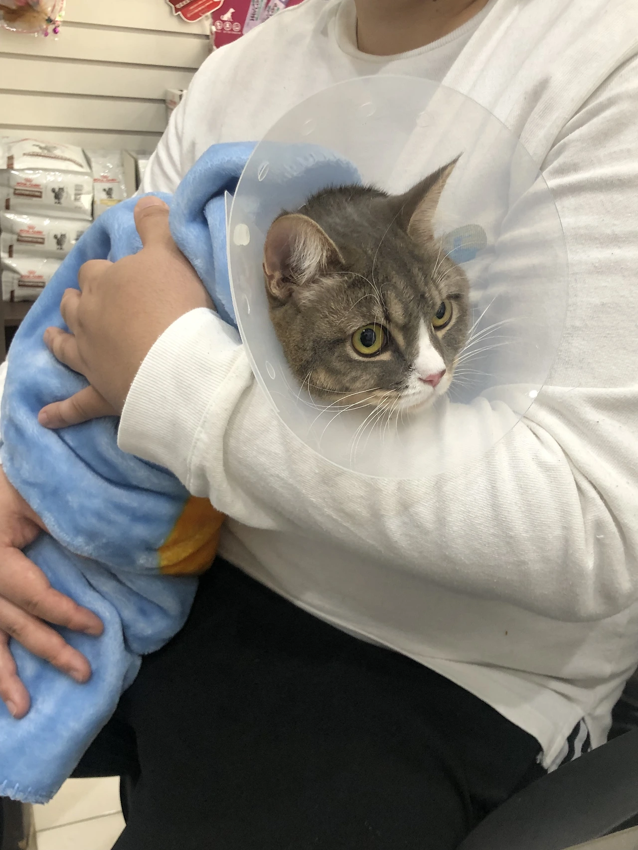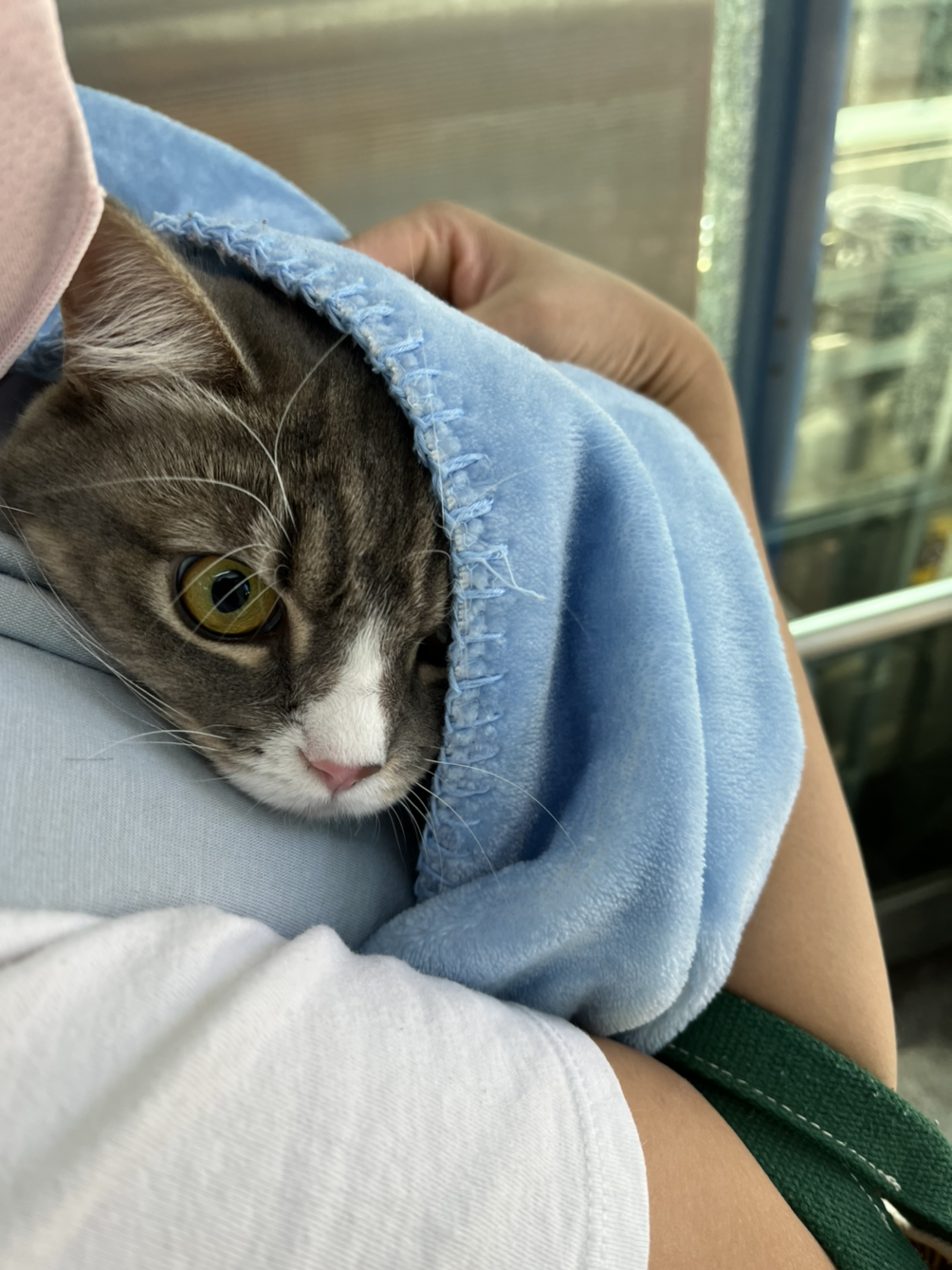 아내가 안고 다독이며 병원으로 향했습니다. 약 15분 정도 걸어가는데 발버둥과 함께 계속 울었습니다. 안정을 위해 담요로 감싸주었습니다. 병원을 가기 싫어하는 시엘이를 달래며 아내의 직장동료가 키우는 반려묘는 펫 택시를 태워서 이동한다는 이야기를 하며 길을 걸었습니다. 펫 택시를 이용하는 직장동료는 평소라면 기본료 정도인데 펫 택시 이용 시에는 2만 원 정도의 비용이 나온다고 했습니다.