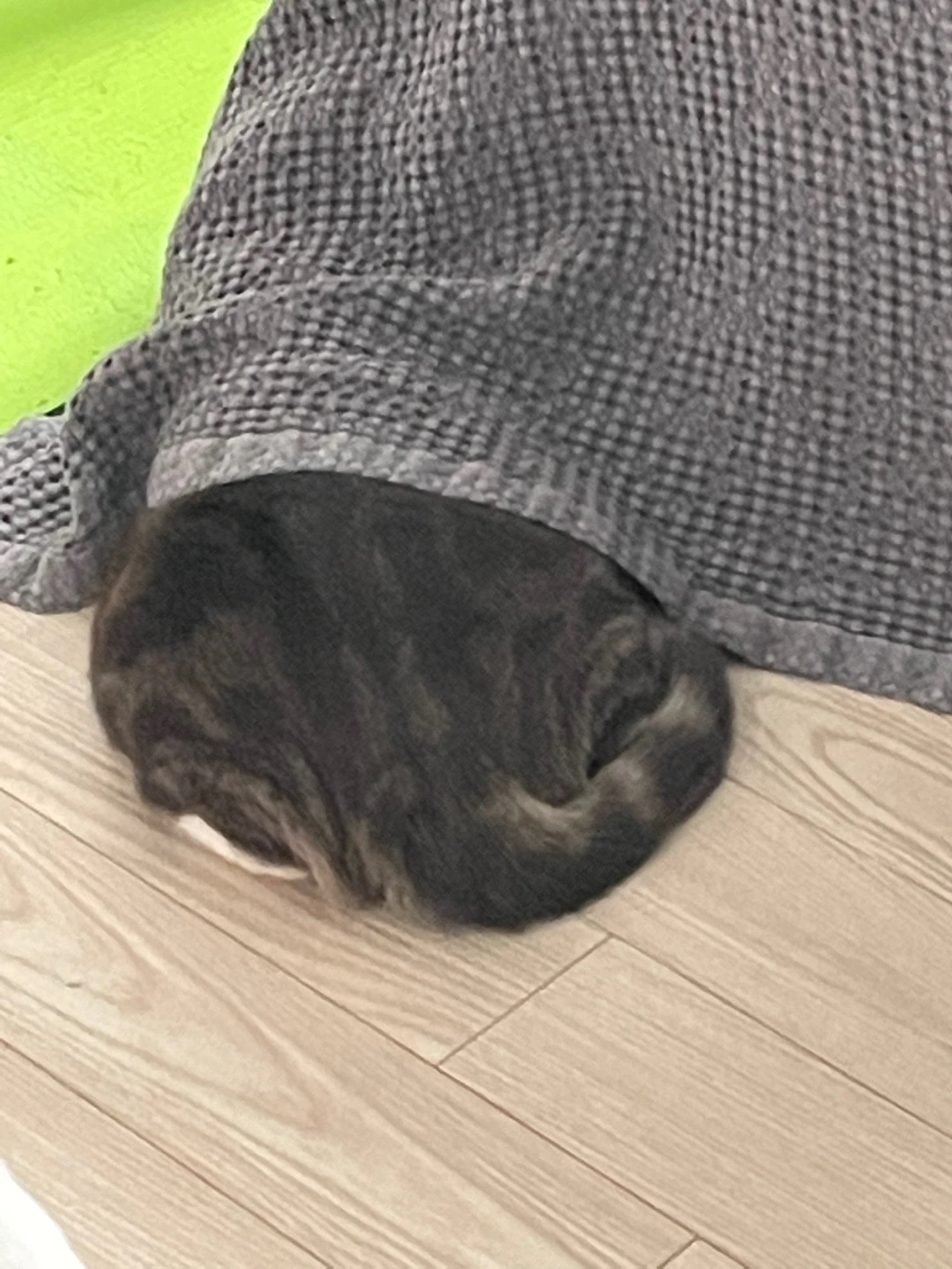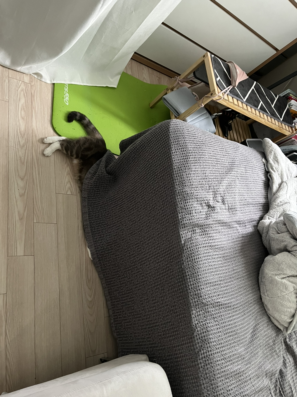 날씨가 추워지며 보일러를 돌리니 따뜻한 곳을 좋아하는 시엘이는 방바닥과 혼연일체가 되어 몸을 지집니다. 심지어 이불 속에 들어가기 싫어하는데 침대 커버 사이로 몸을 숨기고 있습니다. 아예 자리를 깔고 누워버리는 시엘입니다. 방바닥의 열선이 눈에 보이기라고 하는지 어쩜 저렇게 신기하게 따뜻한 자리를 잘 찾는지 모릅니다.