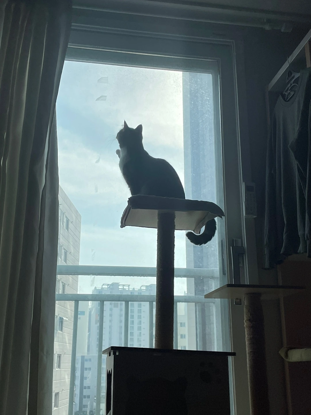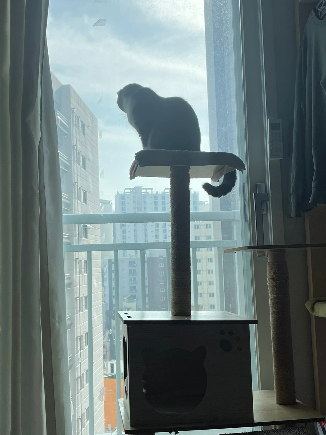 잠에서 깬 시엘이는 돌연 자신의 구역을 관리라도 하듯 캣 타워에 올라섭니다. 가장 높은 곳에 오르면 멀리까지 볼 수 있는 것일까요? 하염없이 밖을 풍경들 바라봅니다. 까치가 집을 짓기 위해 움직이는지 좌우 반복해서 날아다니는 모습을 포착한 시엘이는 눈을 떼지 못합니다.