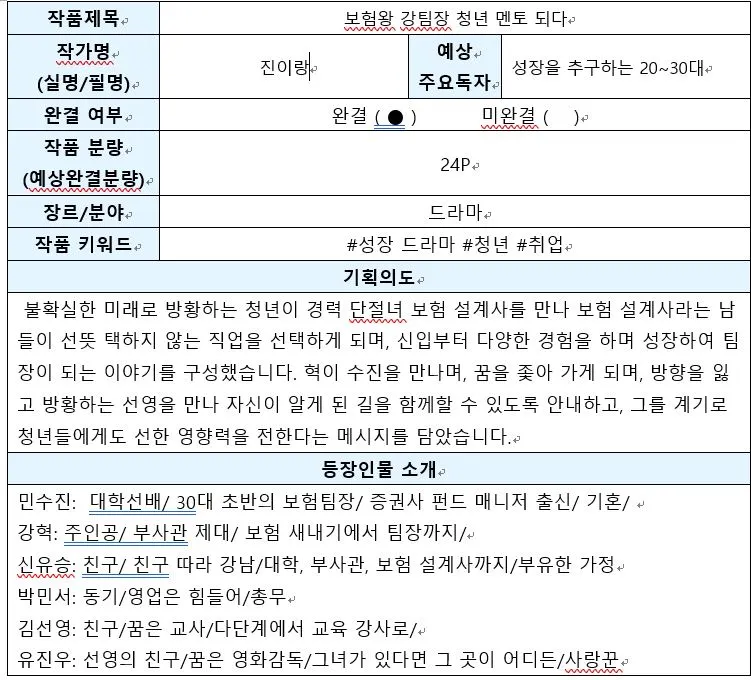 삼성생명에서 웹소설/에세이 공모전에 대한 광고를 우연히 보게 되었습니다. 에세이는 컨설턴트의 지원 분야였기 때문에 웹소설을 준비해 보기로 생각했습니다.