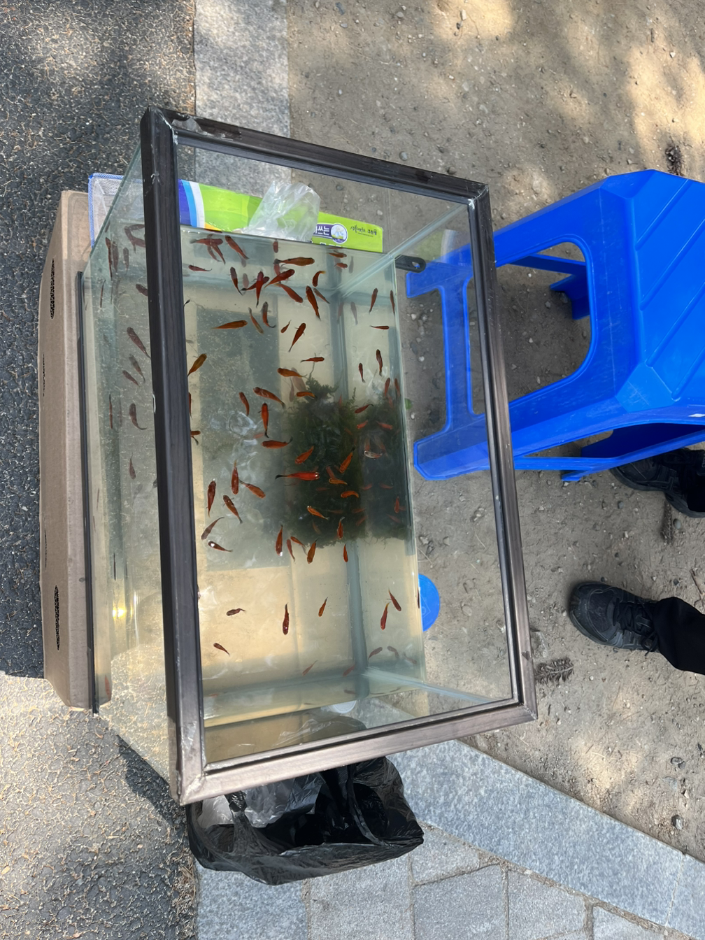 집에서 키우다가 너무 많이 번식해서 머리당 500~1,000원에 팔 생각으로 가지고 나오셨다고 했습니다. 붉은색의 작은 물고기에 꽂힌 저는 이거다 싶었습니다. 그래서 언제까지 계실 예정인지 여쭈어보았습니다. 다 팔 때까지 있을 거라 저녁까진 있을 거 같다고 하셨습니다. 어항 사서 다시 오겠다고 말씀드리고 이동했습니다.