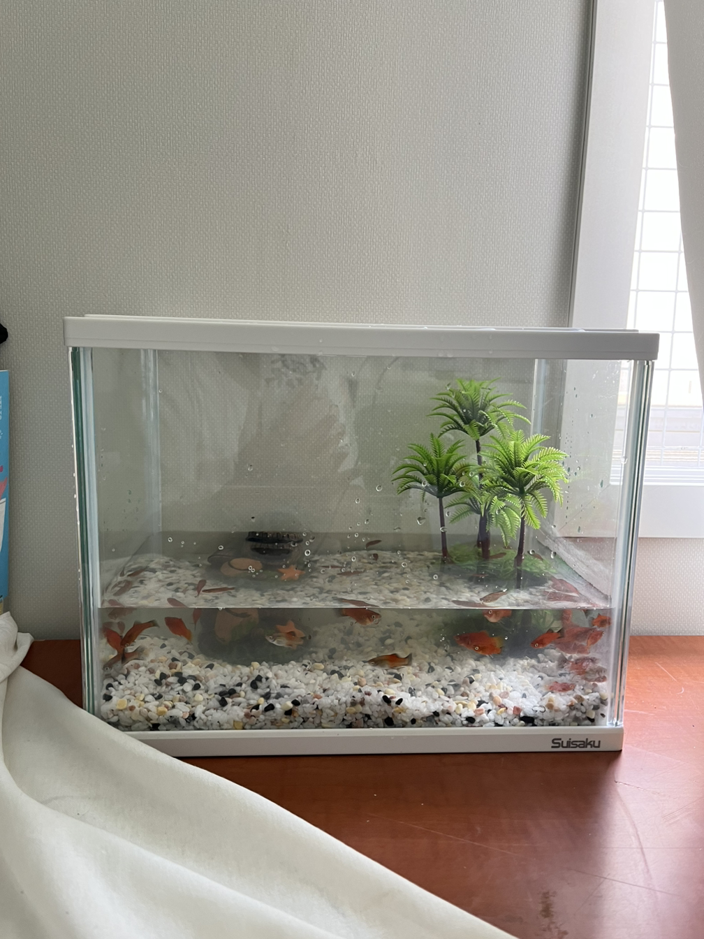할머니께 받은 물고기를 준비한 어항으로 옮겼으나, 물높이가 너무 낮았습니다. 여과기를 설치하기엔 물높이가 낮아서 내일 물의 염소가 사라지면 설치할 계획이었습니다. 그런데 물은 적고, 개체 수는 많으니 물이 금방 탁해지는 것 같았습니다.
