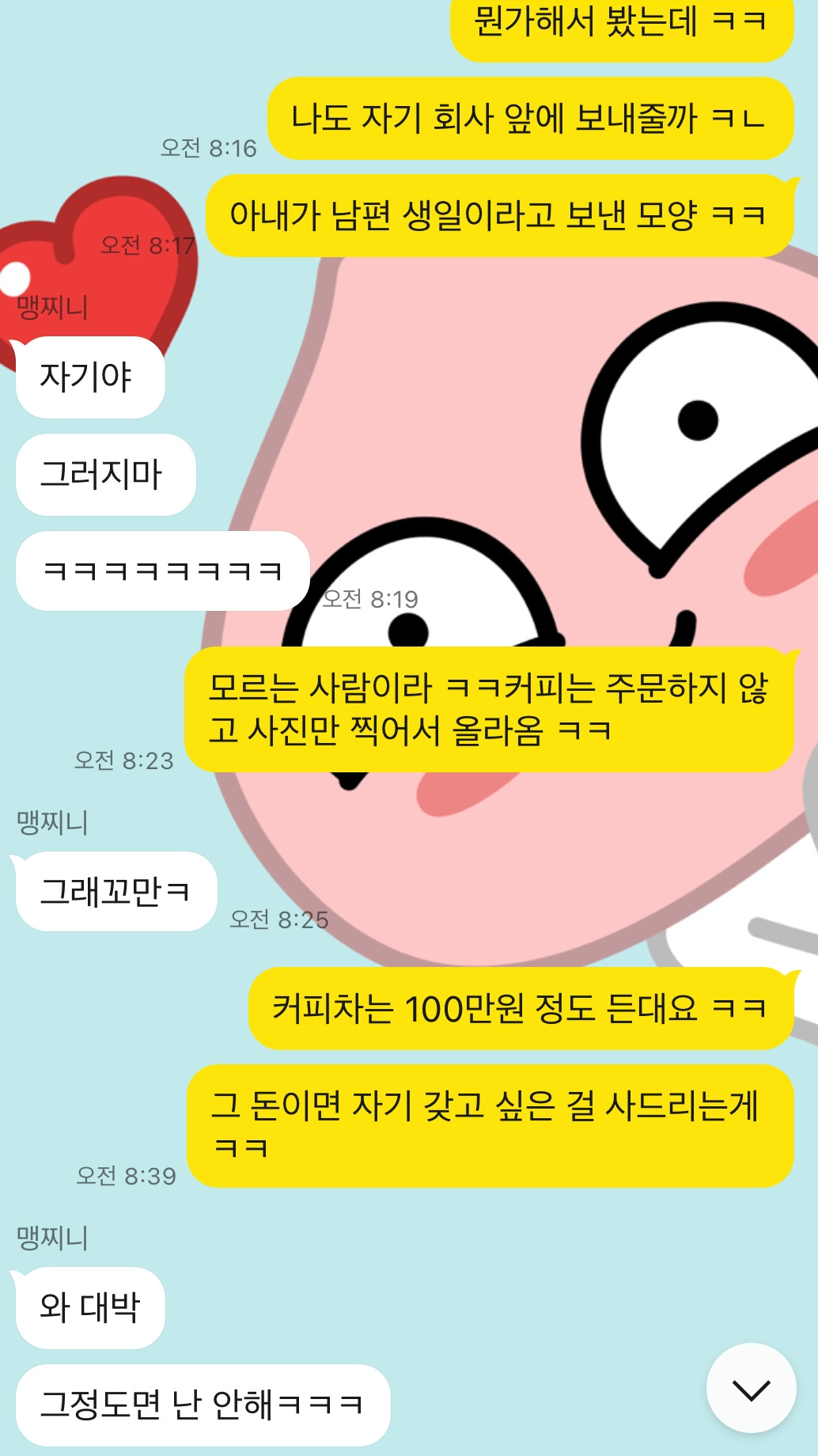 커피차를 실물 영접한 것은 처음인터라 아내에게도 소식을 알렸습니다. 아내는 저와 경제 공동체이기 때문에 거의 생각이 비슷했습니다.