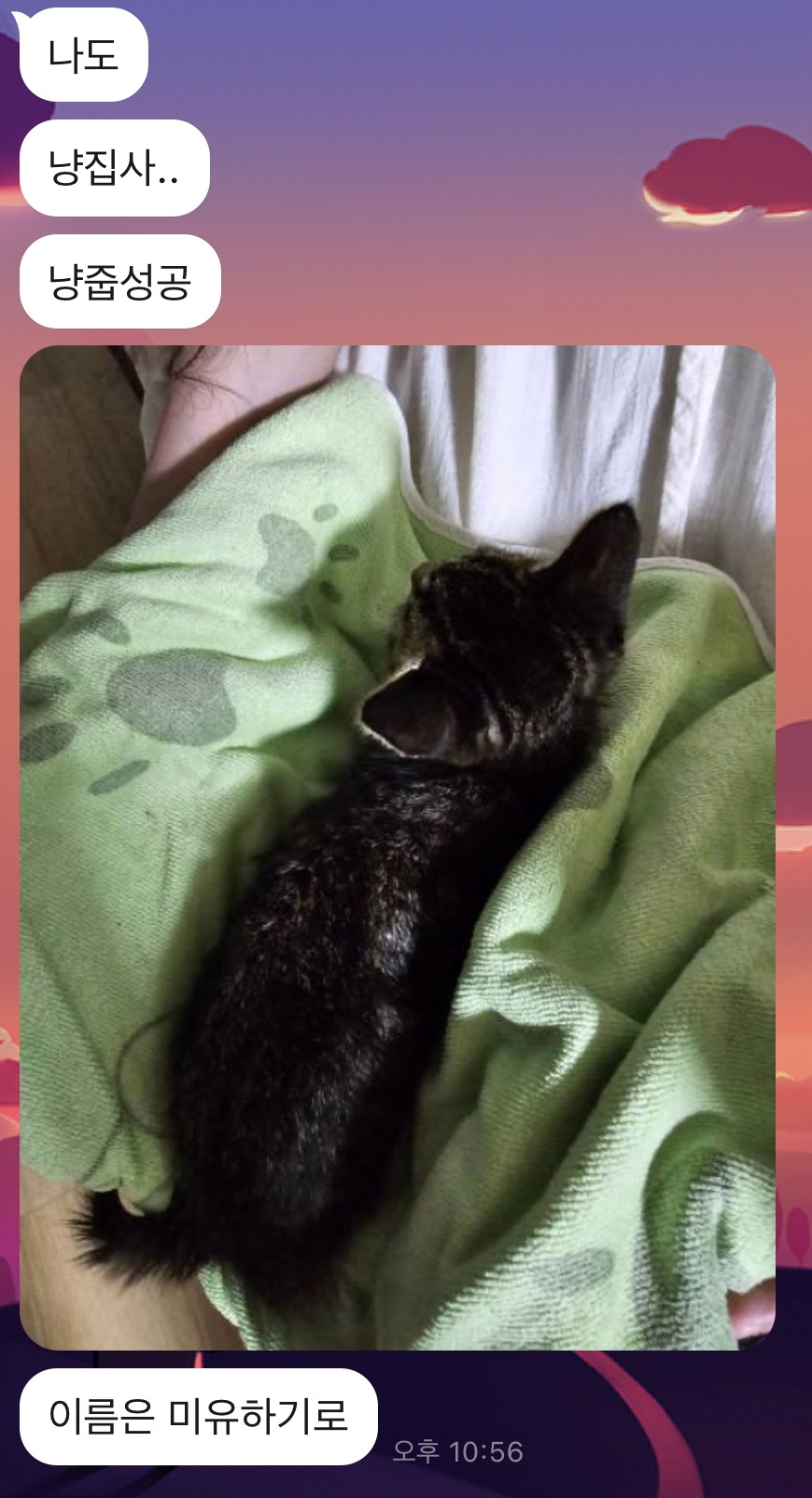이름은 미유로 하기로 했다는 걸 보니, 아가냥의 울음소리가 마치 ‘미유, 미유’처럼 들렸나 봅니다.