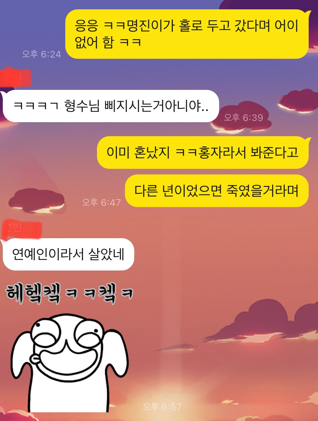 ”아닐걸. 제일 마지막에 나올걸. 자기 같은 사람들 있어서 마지막 순서로 배정할 거야. 초청 가수 중에 홍자가 제일 유명하잖아. H.O.T 오빠들도 항상 마지막 순서였거든. “