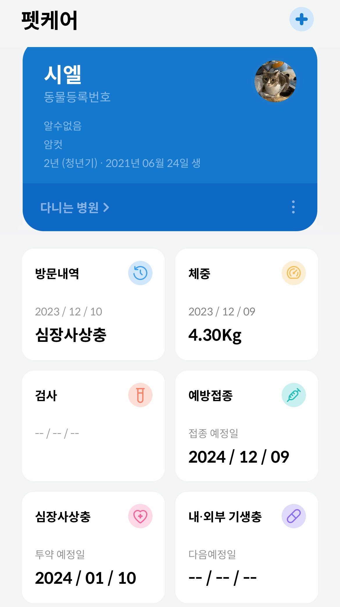 어르고 달래며, 병원에 도착했습니다. 시엘이의 금식 시간을 줄이기 위해 오픈 시간으로 예약한 덕분에 바로 검사가 시작되었습니다. 집사는 매번 실패한 다이어트를 시엘이가 해냈습니다. 얼마 전만 해도 5킬로를찍고, 뚱냥이로 한 걸음 내디뎠는데 4.3킬로였습니다.