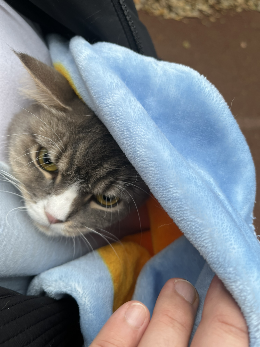 외부 자극에 놀라서 뛰어나가지 않도록 평소에는 안 채우던 하네스와 목줄을 채웠습니다. 아내가 캥거루 슬링백으로 시엘이를 감싸 안았습니다.