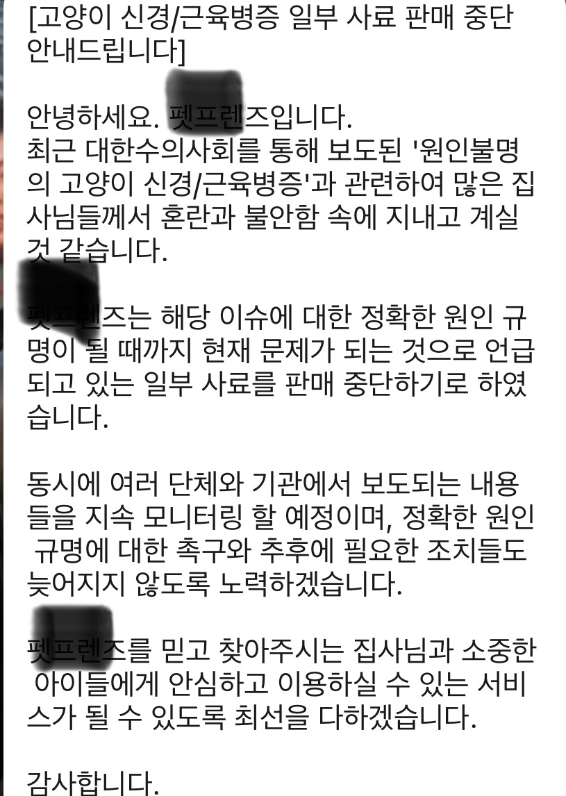 알 수 없는 위험은 공포를 가져옵니다. 요즘 많은 고양이들이 원인불명의 신경/근육병증으로 수명을 다하고 있습니다. 원인이 확실하지 않다 보니, 고양이의 연령, 품종 등 공통분모를 찾다가 H사의 사료를 다수 이용했다는 것을 알게 된 모양입니다.
