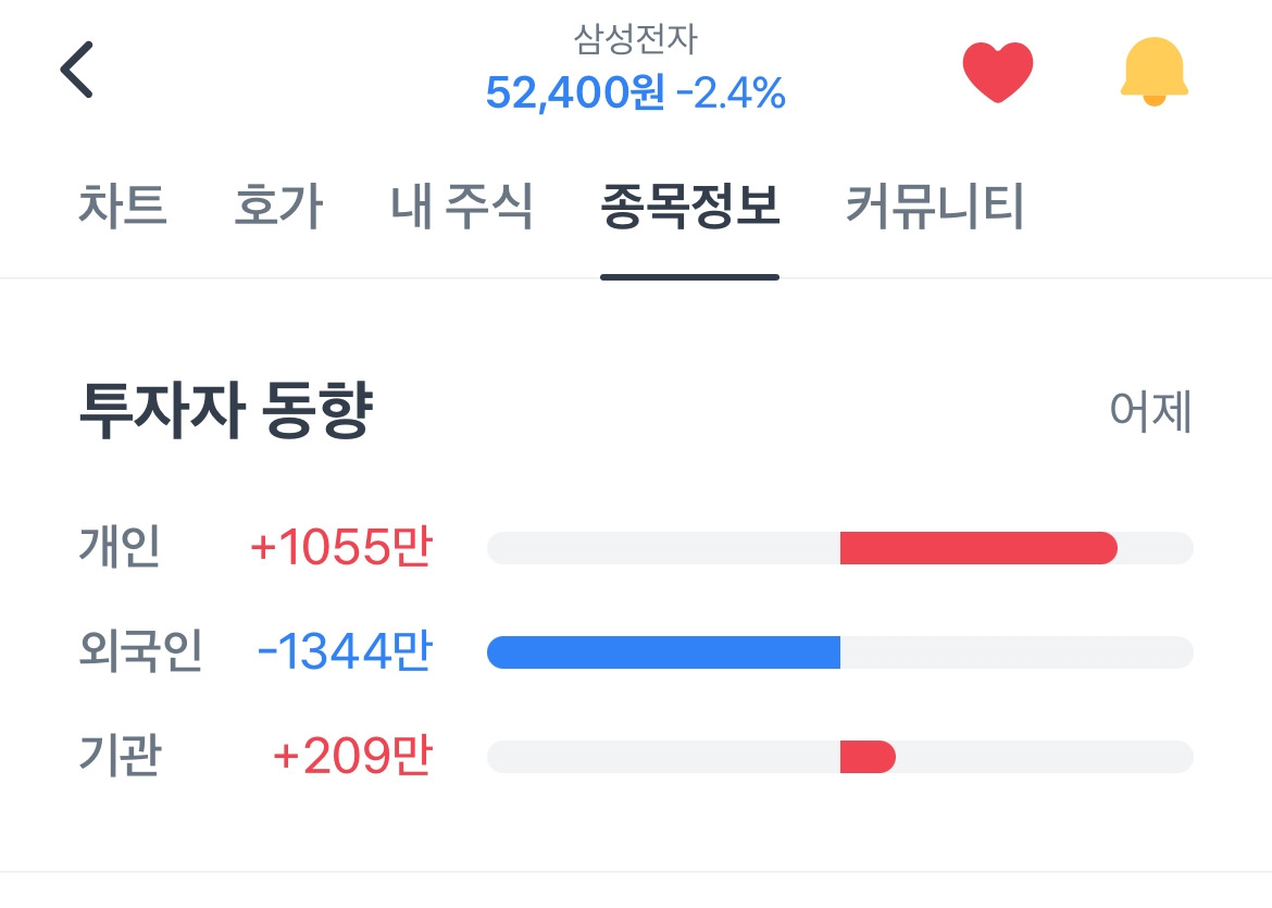 외국인들이 1,344만 주나 매도했는데, 개미들이(개인 투자자) 부지런히 매수했습니다. 저도 제 여유 용돈으로 2주를(1/31 기준 52,400원) 추가 매수했습니다. 커뮤니티에는 긍정적인 글도 많고, 부정적인 글도 많았습니다. 가장 인상 깊었던 글은 “제2의 금 모으기”였습니다. 외국인들이 떠나서 곤두박질칠 수 있었던 삼성 주식을 국내 투자자들이 부지런히 사서 주가 방어에 나름 성공했기 때문입니다.