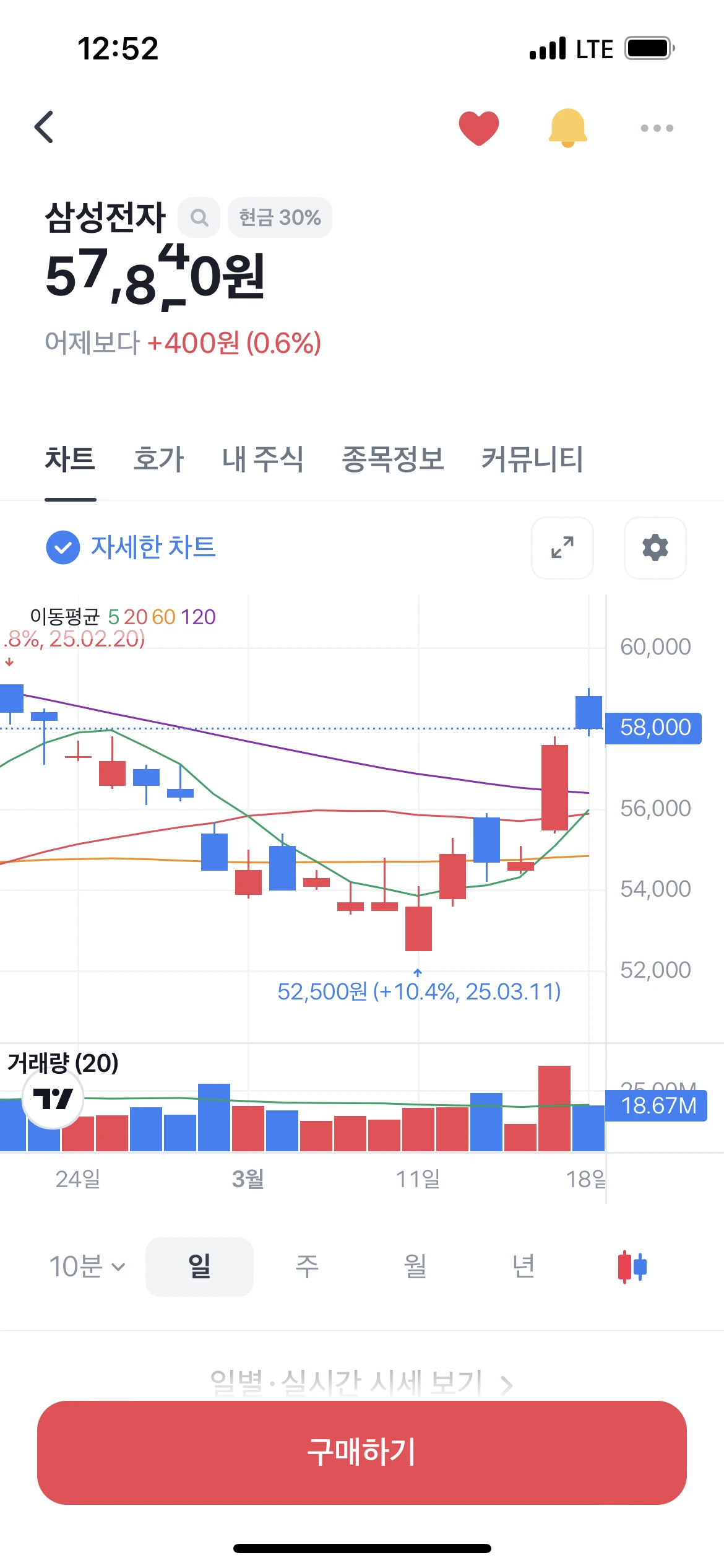 한동안 주식을 손대지도 않다가, 우량주인 삼성전자가 매수 타이밍이란 생각에 평균단가 52,500원에 구매했습니다. 3분기에 오를 것이란 전망이 많습니다. 엔비디아와의 계약이나 반도체 단가 상승 등 여러 호재들이 있습니다. 그리고 10만 전자를 고지에 앞두었던 동학개미들이 있습니다.