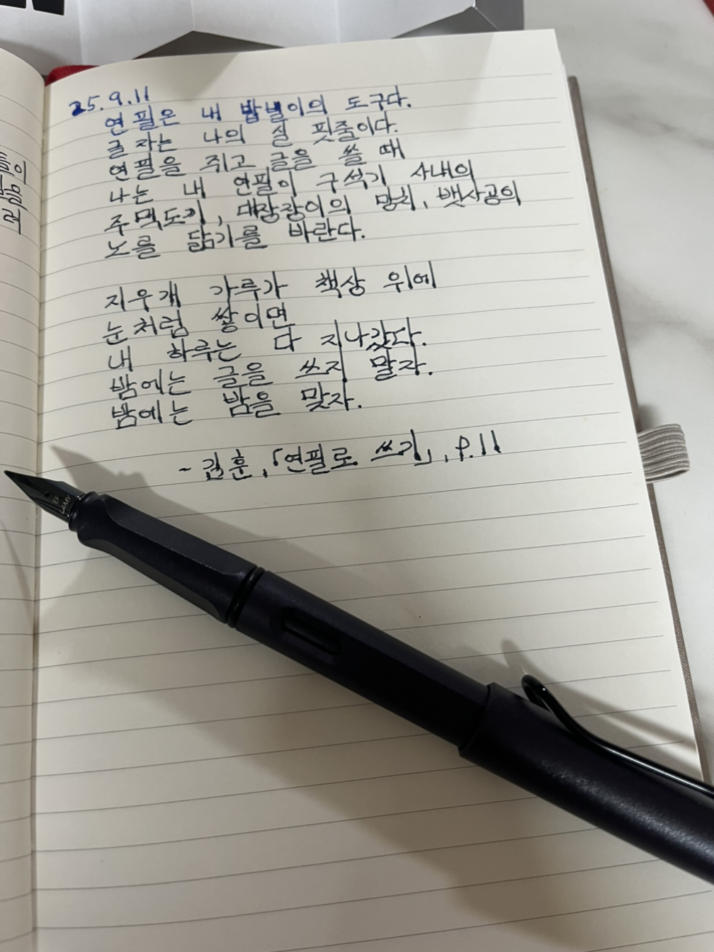 작가의 애환과 고충이 담겨있는 글을 적으며, 저의 만년필도 작가의 연필과 같았으면 좋겠다는 생각을 했습니다. 만년필은 다른 용도로 사용하지 않고, 오로지 필사로만 사용할 것입니다. 핸드폰으로 글을 언제 어디서나 편하게 적을 수 있는 이 시대에 불편하게 만년필과 노트와 필사를 옮길 수 있는 책이 없으면 적을 수 없는 필사를 합니다.