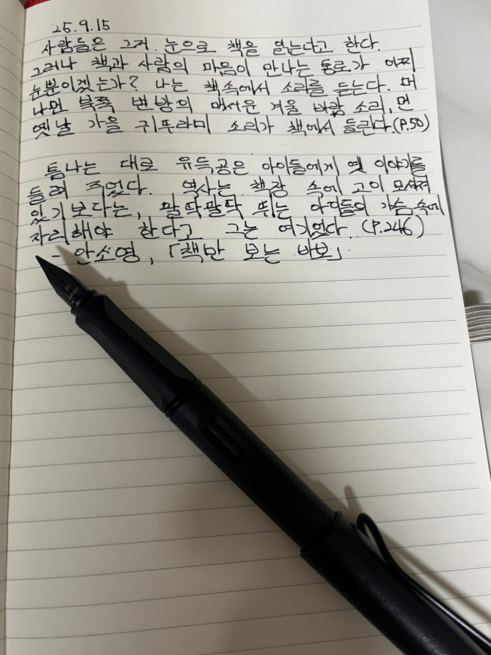 눈으로 읽는 것에 익숙해지면, 단순히 문자를 읽는 것에 불과합니다. 글을 천천히 음미해야 생각을 하면서, 책과 대화를 나눌 수 있기 때문입니다. 책과 대화를 하다 보면 시대와 공간을 초월한 생각의 교류할 수 있습니다. 옛 성현들과 이야기를 하기도 하고, 상상 속의 존재와도 이야기를 합니다. 감명 깊게 읽은 책은 책을 덮고서도 다시 떠올립니다.