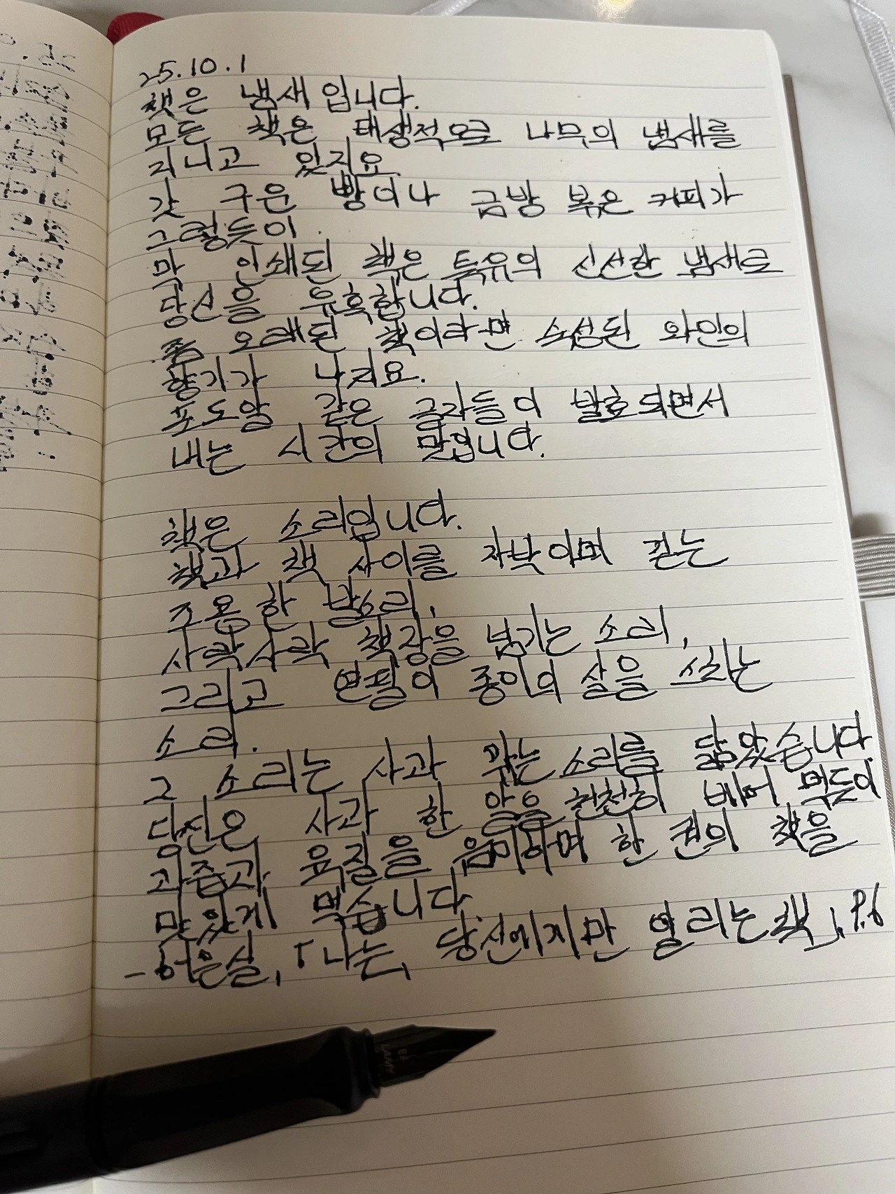필사를 되새기며, 묘사를 하기 위해 주제를 정하고 글을 썼다가 지웠다가 했습니다. 이미 정형화된 식상한 표현인 것 같다는 느낌이 사라지지 않았습니다. 다시 한번 묘사는 어렵다는 생각을 합니다.