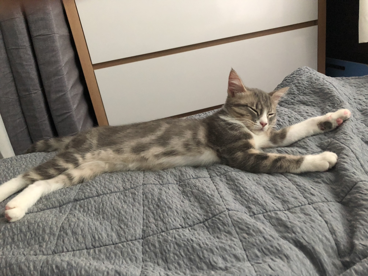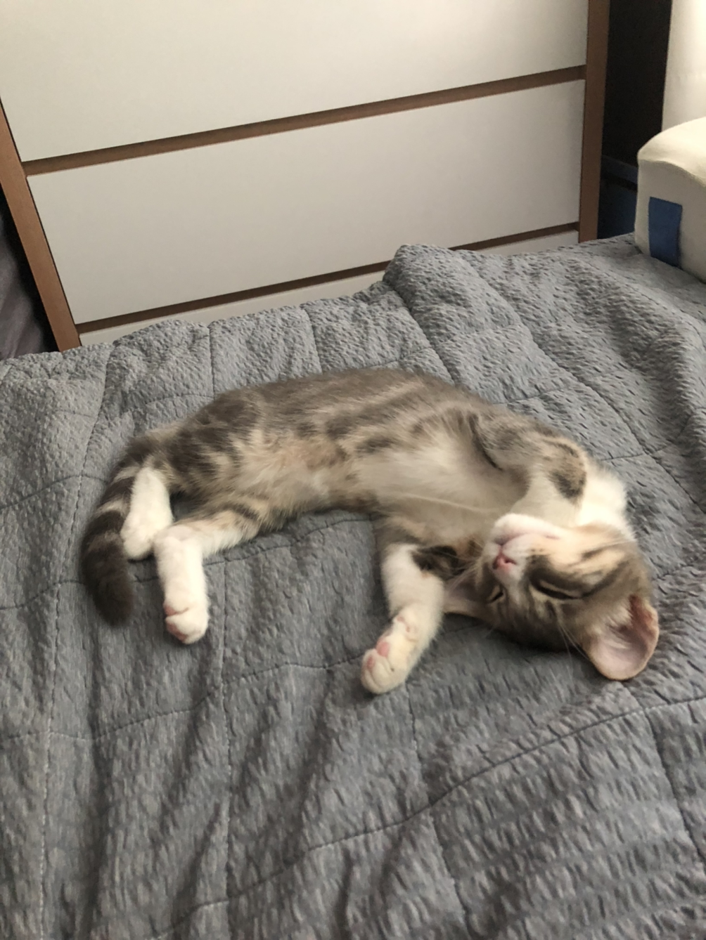 나온 김에 시엘이 간식을 주고 다시 침실로 돌아갔습니다. 간식을 먹자마자 다시 침대로 오더니 배를 깔고 누워 버립니다. 낮에는 잠만 자면서 갑자기 집에 있는 집사가 반가웠는지 졸졸 따라다니면서 잠을 잡니다. 아침에 출근하기 전에 보고 저녁에 퇴근해서 보니 시엘이가 고양이치고 잠이 없다고 생각을 했는데 정말 하루 종일 잠만 자고 있습니다. 이러니 새벽에 쌩쌩하지 하는 생각이 들었습니다.