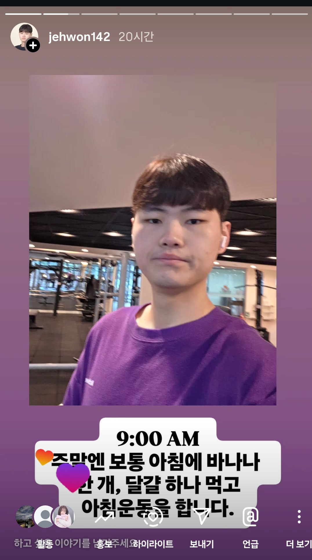 저는 매일 1시간 정도는 헬스와 유산소 운동을 합니다. 주말에는 아침 일찍 일어나서 1시간 30분 정도 헬스장 가서 운동을 하고요.