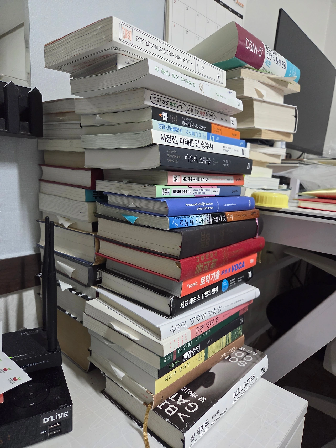 약 3년 전부터 시작한 독서, 지금까지 대략 계산하면 300권 내외정도 읽은 것 같습니다. 이 사진은 자취방에 있는 책만 찍은 거고, 본가에는 훨씬 더 많은 책이 있어요. 그동안, 전자책까지 포함하면 책에다 한 600만 원은 족히 쓴 것 같아요.