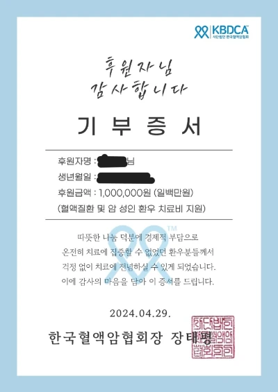 그렇게 '한국혈액암협회'에 100만원을 기부했다.