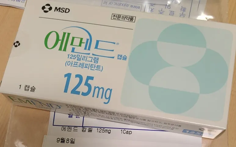 우선 에멘드 캡슐 125mg을 복용하고, 이어서 팔로노세트론(알록시) 주사를 투여받았다.