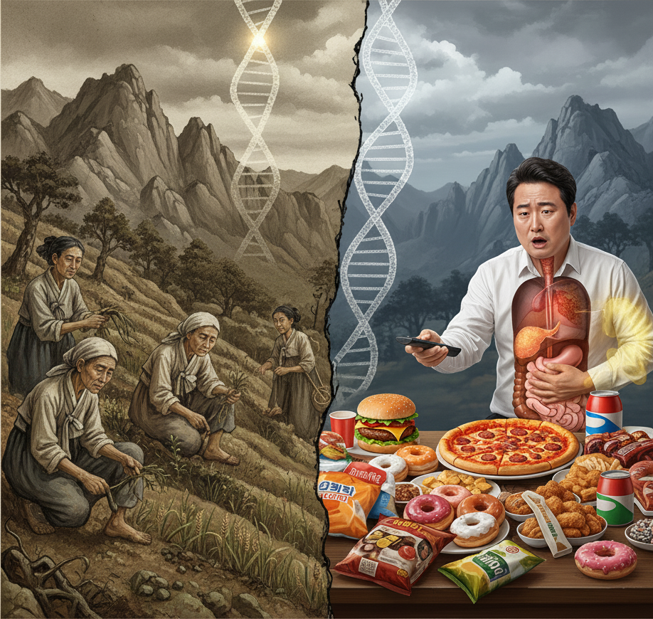서구인들에 비해 비만 인구 비율이 높지 않음에도 불구하고, 한국인에게 유독 당뇨병과 대사 증후군 발병률이 높은 이유가 바로 여기에 있다. 우리의 몸은 넘쳐나는 에너지를 처리하는 데 익숙하지 않다. 절약 유전자는 여전히 “언제 굶주림이 닥칠지 모르니 무조건 저장하라!”고 소리치고, 그 결과 혈액 속의 당은 지방으로 빠르게 축적되어 혈관과 췌장을 병들게 한다. 굶주림을 이겨내기 위해 진화한 몸이, 이제는 풍요 때문에 병들고 있는 것이다. 당신의 혈당 수치와 허리둘레에는, 지금도 풀뿌리로 연명해야 했던 우리 조상들의 처절한 기억이 고스란히 새겨져 있다. 이것이 바로 땅과 굶주림이 우리에게 남긴 첫 번째 유산이자, 우리가 풀어야 할 첫 번째 숙제다.