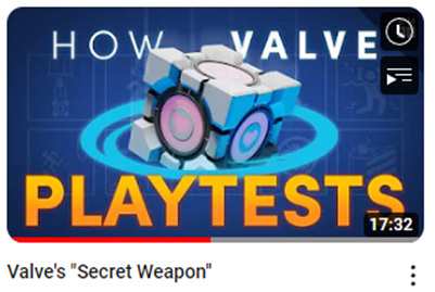 영국의 게임 저널리스트 마크 브라운이 운영하는 GMTK (Game Maker's Toolkit) 채널에서는 게임 디자인의 원리나 게임 제작기를 소개하는 것으로 유명합니다. 그 중 최근 공개한 ‘밸브의 비밀 무기(Valve’s “Secret Weapon”)’라는 영상에서 게임 플랫폼 스팀(Steam)과 '하프라이프 시리즈', '포탈 시리즈', '팀포트리스 시리즈' 등 많은 명작 게임을 개발한 게임사 밸브(Valve)의 플레이테스트 문화 사례를 소개하고 있는데, 게임 테스트가 줄 수 있는 긍정적 영향을 보여주는 좋은 사례라 소개 드립니다.