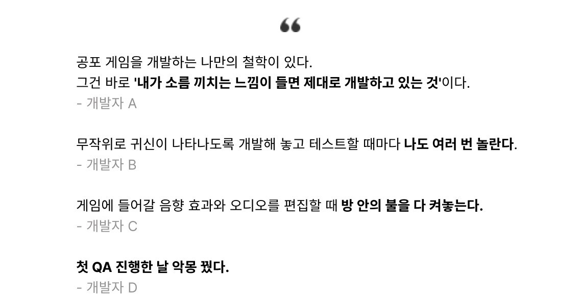 공포 게임을 검수하는 QA 직군의 경우 게임 속 공포 장면을 수십, 수백 번씩 반복해서 마주합니다.