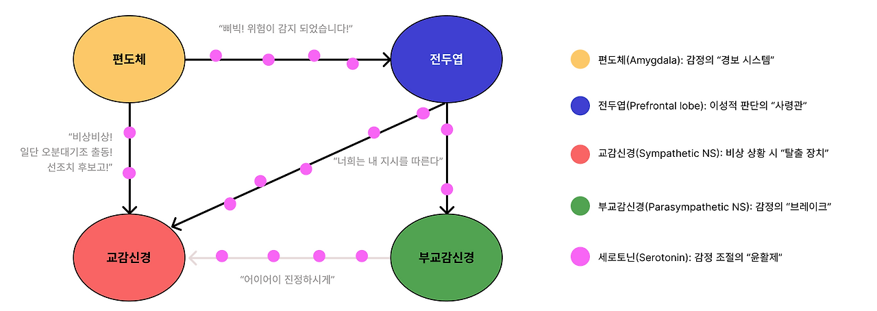 세로토닌은 편도체의 과도한 불안 신호를 억제하고, 전두엽이 감정을 더 잘 조절하도록 돕습니다. 또한 교감신경과 부교감신경의 균형을 맞추어 스트레스를 더 효과적으로 관리하고, 평온함을 유지하는 데 중요한 역할을 합니다.