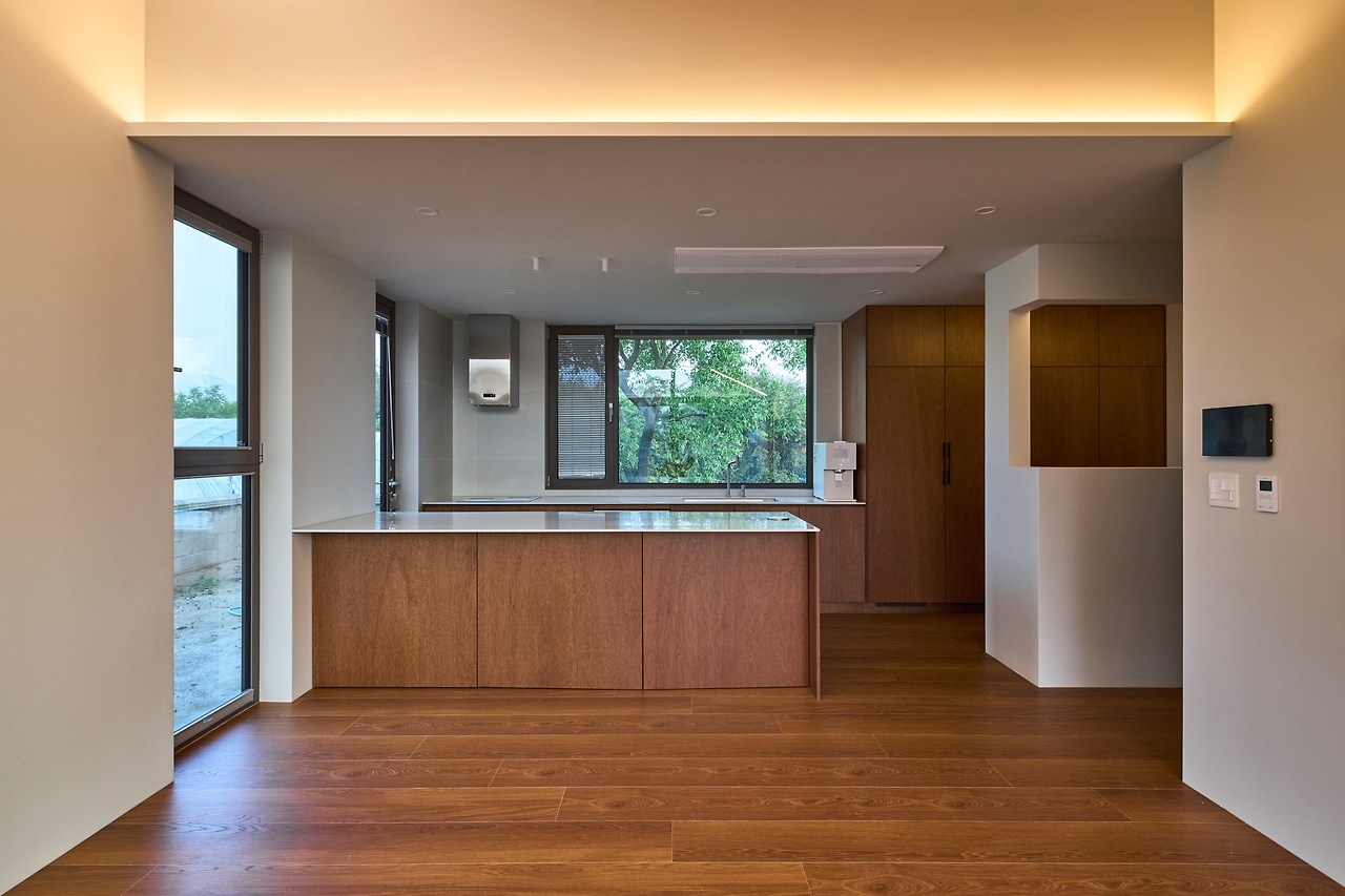 비가 새는 기존 집의 모임지붕은 걷어내고 조적 벽은 살려 구조 벽체로 활용하기로 했다. 기존 벽체가 나누고 있는 공간 단위가 크지 않아 기존의 집은 침실과 서재, 황토방, 드레스룸, 화장실 등으로 사용하고 수평으로 증축되는 공간에 거실과 주방을 계획했다.