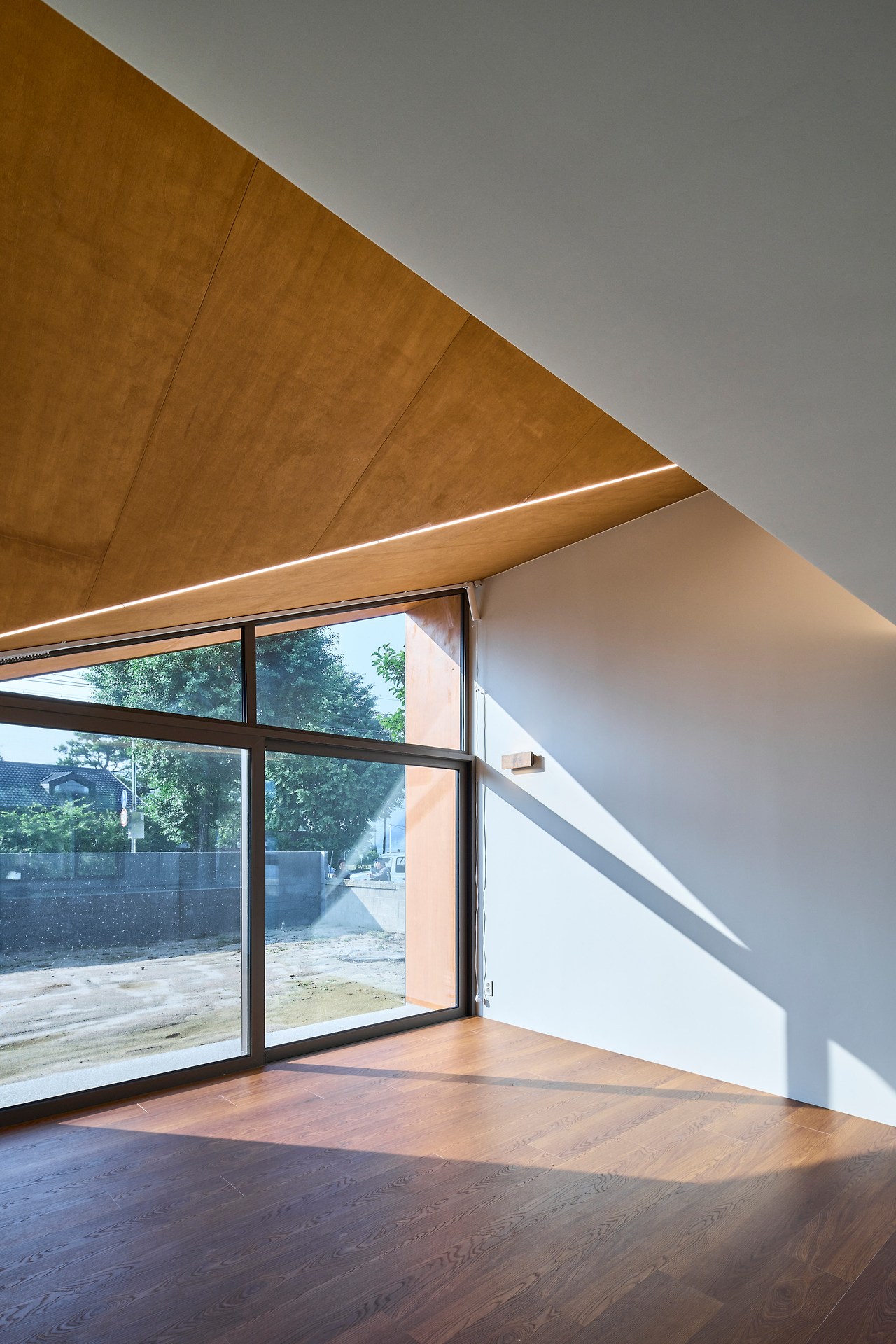 거실은 모임자붕의 변형된 형태가 그대로 드러난다. 정적인 생활공간과 대비되는 역동적인 공간이다.