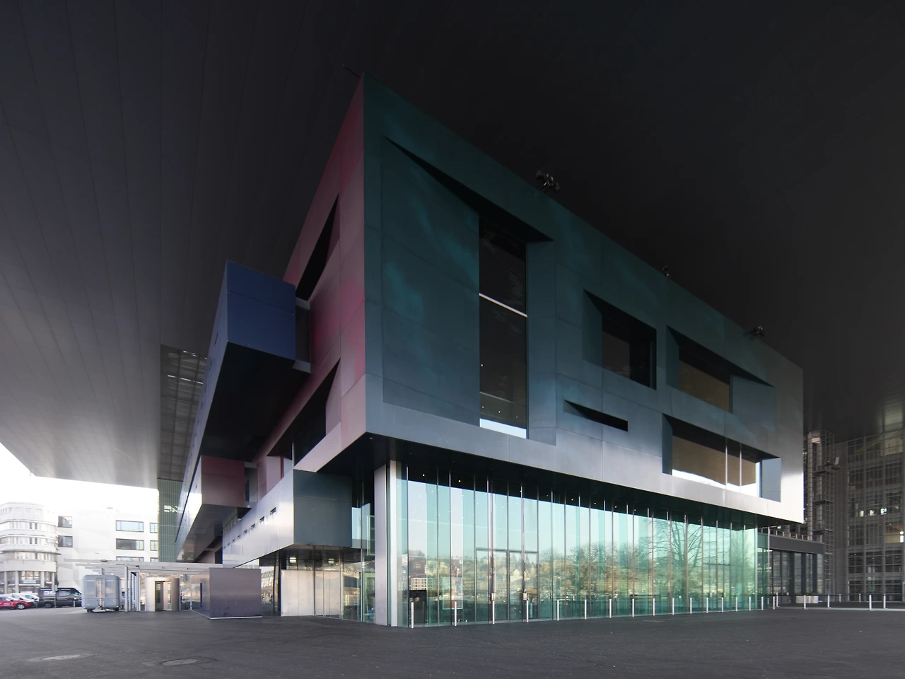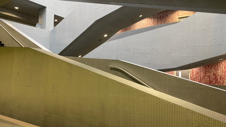 사선으로 돌출되고 드러난 입면이 다이나믹하다라고 느껴지기 전에 분절없이 연속된 면 때문에 스케일이 왜곡되어 있다라는 느낌이 더 강했다.