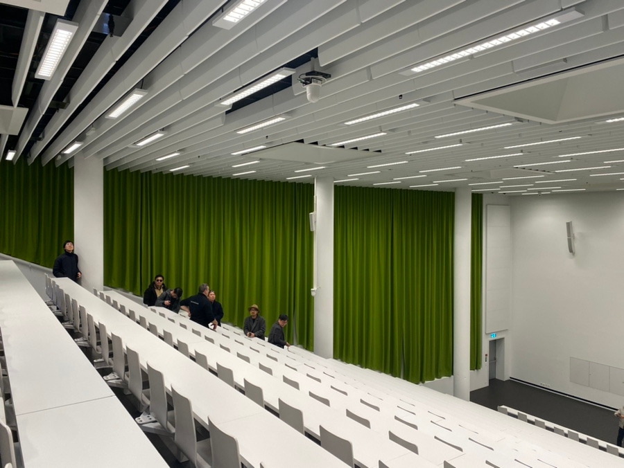 화이트의 책상과 그 배열을 따르는 천정의 루버 덕분에 밝고 활기차다. 강의실 내 울림을 방지하기 위한 녹색 커튼이 멋졌다.