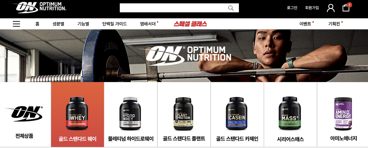 ① 옵티멈 뉴트리션 Optimum Nutrition : 블랙+골드+레드, 볼드한 타이포