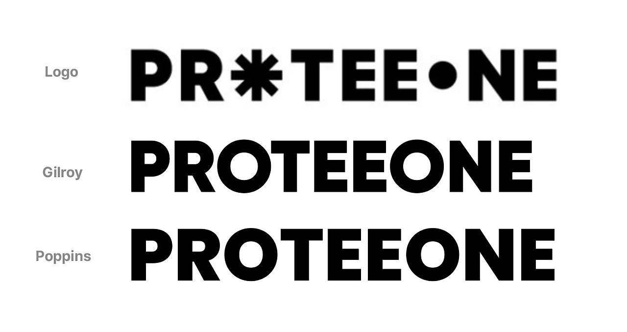 내친 김에 로고까지 살펴봅니다. Gilroy 혹은 Poppins 폰트 그 어디즈음 있어보여서 직접 타이핑해서 비교해 보았어요. 지오메트릭한 폰트를 베이스로 한 덕에 볼드함과 귀여움이 함께 느껴져요. 중간 기호들은 귀여움을 한층 더해주지만 처음 보는 사람이거나 외국인들이 읽기 어려울 듯 해요. (프..ㄹ..티..네..? 혹은 프로티..네?)