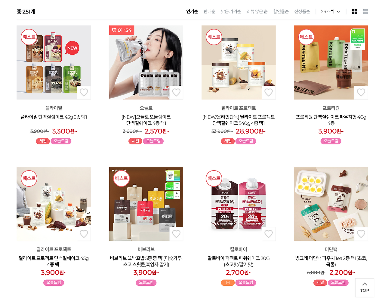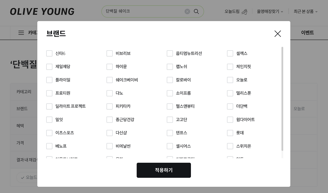 문득 올리브영에는 얼마나 많은 단백질 쉐이크가 입점되어 있는지 궁금해져 바로 검색해보았습니다.