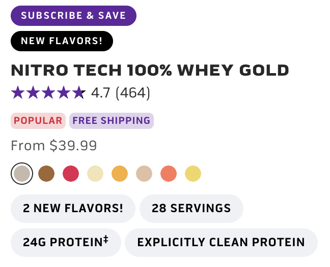 이 중 제일 다양한 맛의 두 번째 제품 'Nitro Tech 100% Whey Gold'. 맛 별로 어떻게 표현하고 있는지 비교해보았습니다.