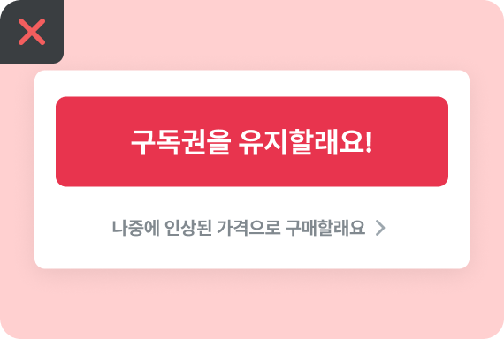 의도적으로 제품을 설계하여 사용자에게 부당하게 이익을 취하거나, 원하는 방향으로 행동을 유도하는 것을 다크패턴이라 정의해요. 사용자의 목소리를 빌려 ‘구독권을 유지할래요.’, ‘혜택 포기할게요.’와 같은 버튼을 만드는 것은 사용자를 기만하는 행위이므로 주의하세요!