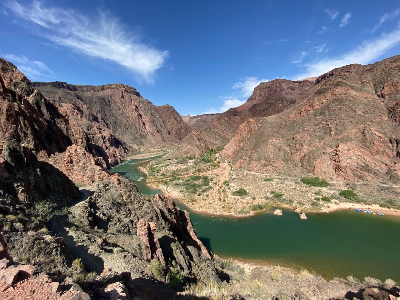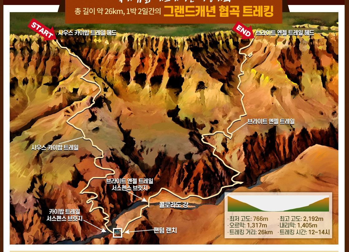 우리는 스타트 지점인 사우스케이밥(South Kaibab Trail)에서 협곡 가장 아래로 내려가 콜로라도강을 건너 브라이트엔젤(Bright Angel Trail) 트레일로 다시 협곡 위로 올라오게 되는데 총 여정 약 30km 12~14시간 이상 트레킹은 평생 기억에 남는 아름다운 추억이 된다.