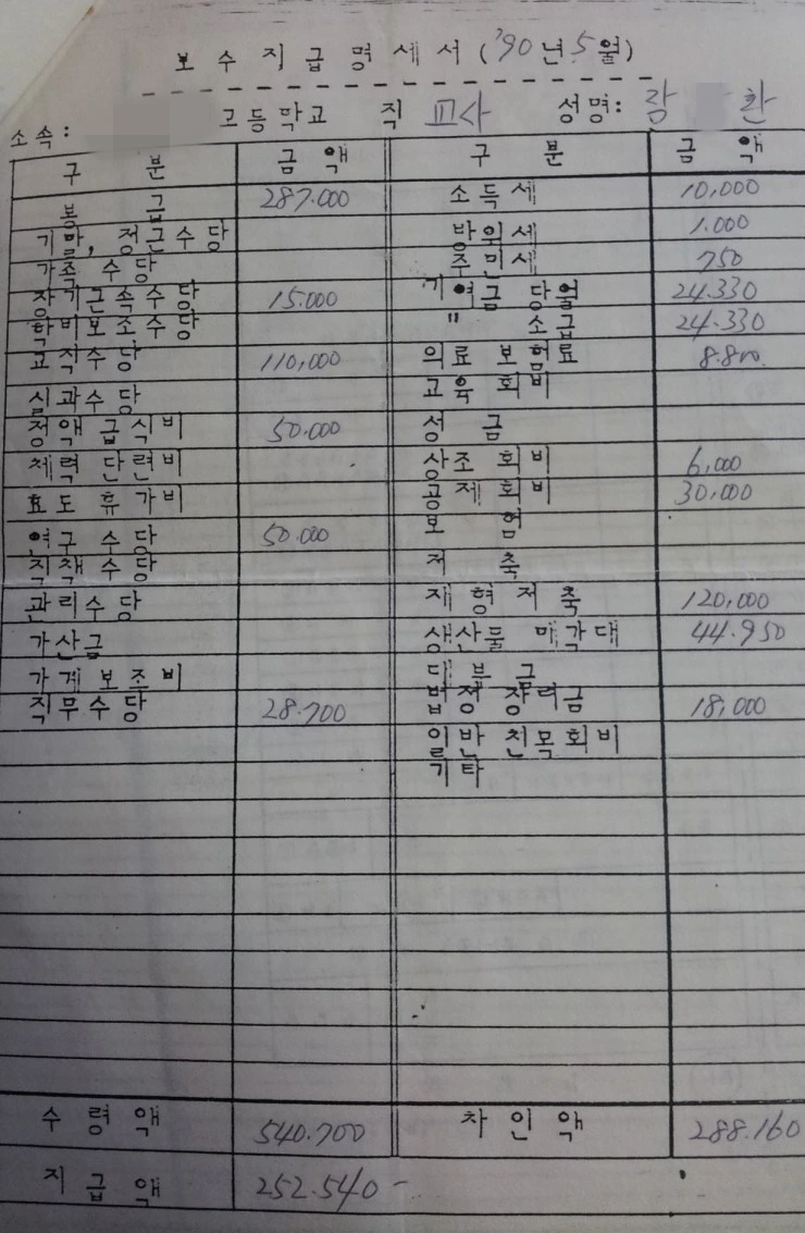 월급봉투 사진에서 보듯이 한 달 30만 원이 안 되는 월급봉투를 아내에게 전해주면 아내는 자신의 월급과 합하여 한 달 살림을 살아야 한다. 미래를 위해 저축이라도 하려면 품위유지비 같은 것은 사치였다. 그런데 퇴직하면서 내 인생에 가장 고마워해야 할 선생님이 되었다.
