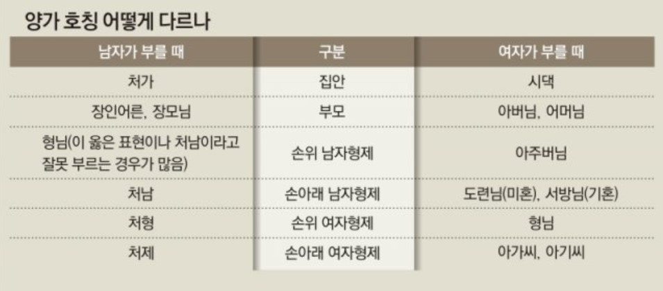결혼 초기에 결혼하지 않은 남동생은 도련님, 결혼하지 않은 여동생은 아가씨라고 부르면 합당하다. 남편의 동생이 결혼하면 도련님이 아니라 ‘서방님’이라고 불러야 한다. 심지어 시누이의 남편도 서방님이라고 부르는 게 맞다. 멀쩡한 내 서방을 두고 왜 애먼 사람에게 서방님이라고 하는지…. 남편 여동생의 남편은 ‘서방님’이라고 부르는 게 표준 호칭이지만 설문 응답자의 62.7%는 ‘고모부’라고 부른다고 했다.