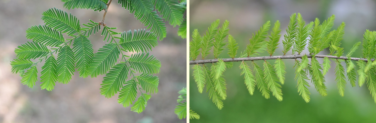 생김새가 비슷한 수목으로 메타쉐콰이어와 낙우송이 있으며, 심지어 가까이에서 유심히 보지 않는 한 구별이 힘들다. 차이점은 메타세쿼이아는 잎이 마주나는데, 낙우송은 잎이 어긋난다는 점이다. 또한 크게 자란 낙우송은 공기뿌리가 송송송 튀어나오는데 반해, 메타세쿼이아는 그런 게 없다.
