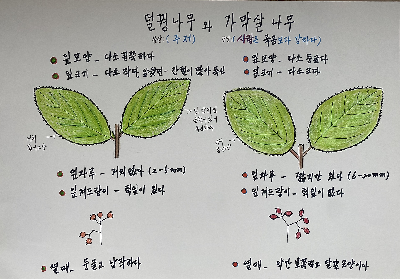 덜꿩나무는 잎이 곁가지 하나 더 올라가 위에서 자라기 때문에 아래서 살펴보면 초록의 색깔도 다른 나무의 잎과는 조금 다르게 나타난다고 하였다. 그런 설명을 듣고 위를 쳐다보니 초록의 잎 색깔이 더 다양하고 멋져 보였다. 자연의 신비란 끝이 없다.
