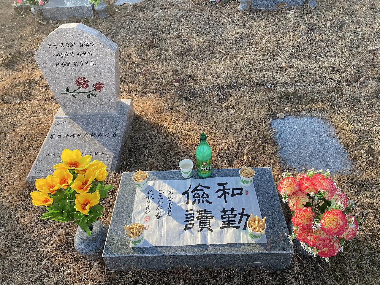 2024년 한 해가 마무리 되어가는 12월 27일 선친이 계신 산소를 다녀왔다. 아무 말씀도 없는 아버지의 묘비를 닦고 장미꽃문양을 그려면서 아버지와 무언(無言)의 대화를 나누었다. 아버지는 지금 무슨 생각을 하고 계실까? 아버지가 내가 하는 행동을 보고 계실까? 만일 돌아가시기 직전이었다면 나에게 어떤 말씀을 남기고 싶으신 것일까? 혼자 2시간 동안 아버지와 대화를 하면서 장미 무늬를 유화로 깨끗이 그려놓고 돌아왔다.