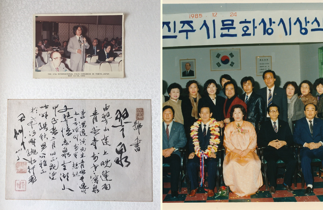 사진 촬영에도 남다른 재능이 있으셔서 진주촉석루 설경과 월아산 일출 사진은 진주시를 상징하는 대표작품으로 남아 있기도 하다. 아버지의 글씨는 가히 명필이라 할만하다. 우연히 발견한 아버지의 친필글씨를 보면 요즘 사람들이 쉽게 쓰기 힘든 자연스럽고 숙련된 손놀림이 엿 보인다. 인쇄업이 쇠퇴기에 들어서는 와중에서도 출판업을 끝까지 유지하려고 하면서 진주의 다양한 예술인 문인들과 교류를 하고 글을 쓰고자 했던 아버지의 마음을 이제야 조금 이해할 수 있지만 당시에는 그 뜻을 헤아리지 못한 자식으로 죄송한 마음 가득하다.