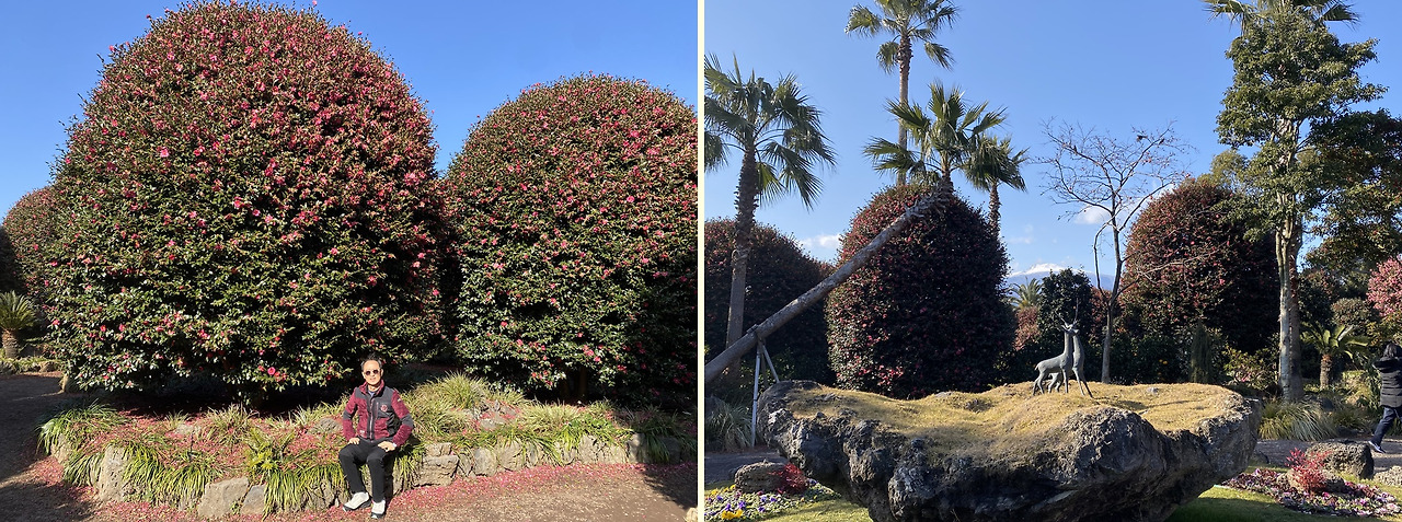 이틀 동안 눈꽃을 원 없이 보고 즐겼다. 평소 감정표현이 잘 없으신 석루 형님도 즐겁게 눈밭에 쓰러졌다. 하산하여 동백꽃을 보러 갔다. 위미 동백나무 군락지와 동백수목원이었다. 두 곳 모두 현맹춘(1858~1933) 할머니와 관련이 있다. 1878년 한라산에 자생하는 동백나무 씨를 받아 심은 위미동백나무 군락지는 147년이 되었다. 그로부터 약 100년이 지난 1977년 손자가 이룬 동백수목원은 KBS 애국가 영상 배경으로도 나온 곳이다.