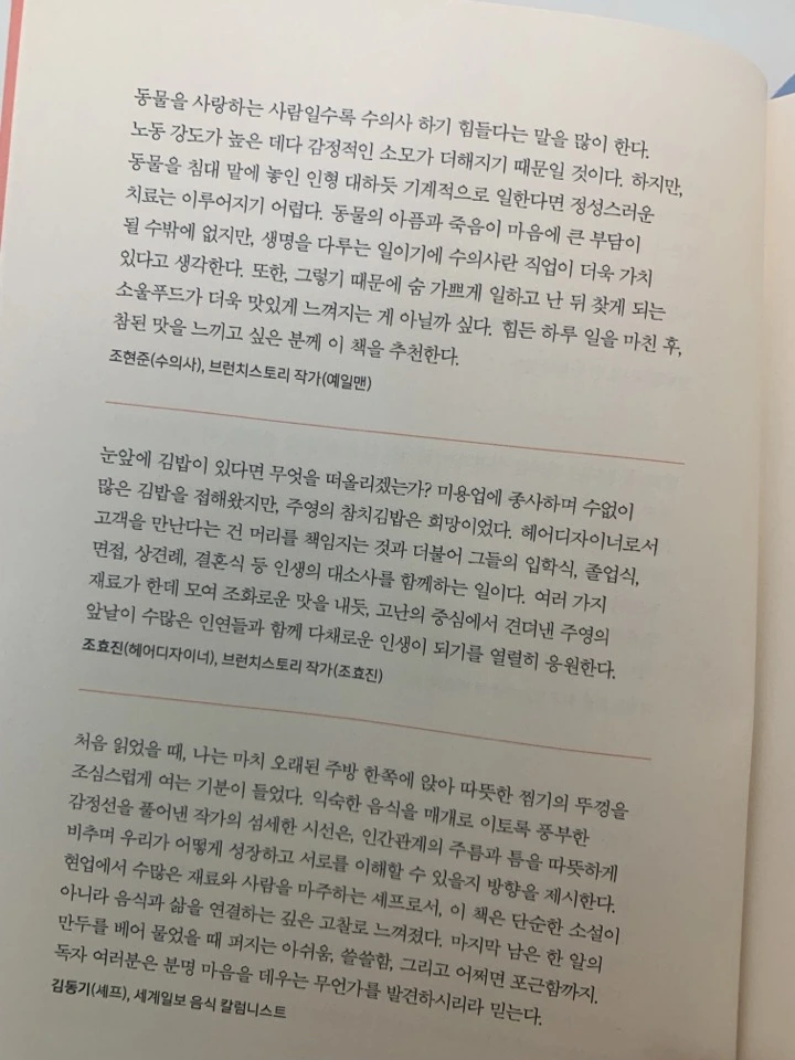 비록 수의사 부분만 읽었지만, 수의사란 직업에 대한 내용이라든지, 수의사만이 가질 수 있는 고뇌라든지, 여러 가지 면에서 충분히 공감할 수 있는 내용이라 기쁜 마음으로 추천사를 작성했습니다.
