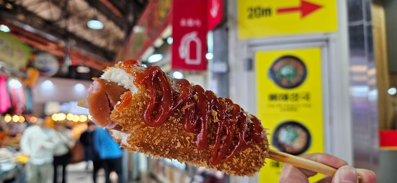 뽀얀 고기 국물에 고기를 듬뿍 올려놓은 고기 국수와 매콤해 보이면서도 쫄면 같은 느낌의 야채와 고기가 푸짐한 비빔국수였다. 먹기 시작했을 때는 입이 행복했다. 이제 다니면서 디저트를 찾아보자며 배부른 두 모녀가 시장 안을 여유 있게 걸어 다녔다. 배가 부르니 급할 것이 없어 어느 분식집 앞에서 핫도그 하나씩 손에 들었다. 딸은 설탕과 케첩을 많이도 뿌린다.