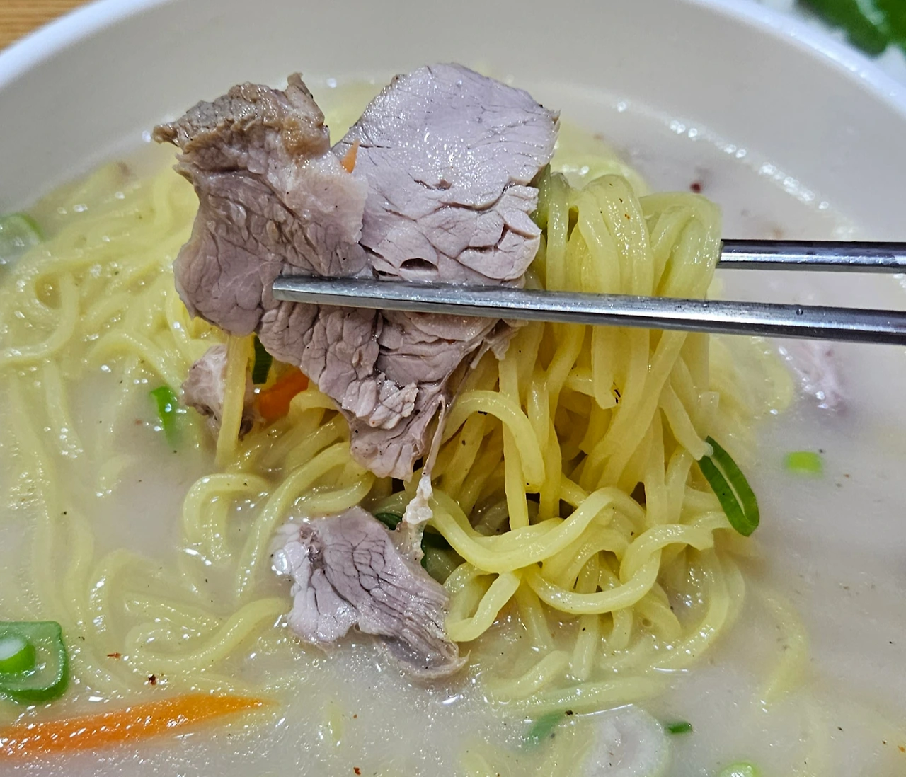 주변을 둘러보니 시장이라는 점을 감안하면 나름 깔끔한 국숫집이다. 잠시 후에 주문한 국수가 나왔는데 고기를 좋아하는 우리 딸이 탄성을 질렀다. 시각을 만족시키니 사진을 찍어야 했다.