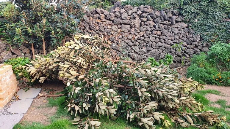 다행스럽게도 이곳의 자연환경에 특별히 잘 자라는 나무가 있었다. 자연 발아하여 많이 자란 나무 중에 키가 큰 나무가 있다. '까마귀쪽나무'라고 하는데 제주 방언으로 '구럼비', '구럼비낭'이라고 불리면서 척박하고 바람이 심한 이곳 판포리에 많이 자란다. 까마귀쪽나무는 예쁜 색을 띠고 있지는 않지만 대견하다 싶게 잘 자랐다. 키가 커진 까마귀쪽나무는 무더운 여름날 시원한 그늘을 만들어주며 제 역할을 톡톡히 해냈다. 그런 나무가 청명한 가을 하늘을 가리고 햇빛을 가리기 시작하자 사람이 사는 마당을 침범하고 있다는 생각이 들었다.