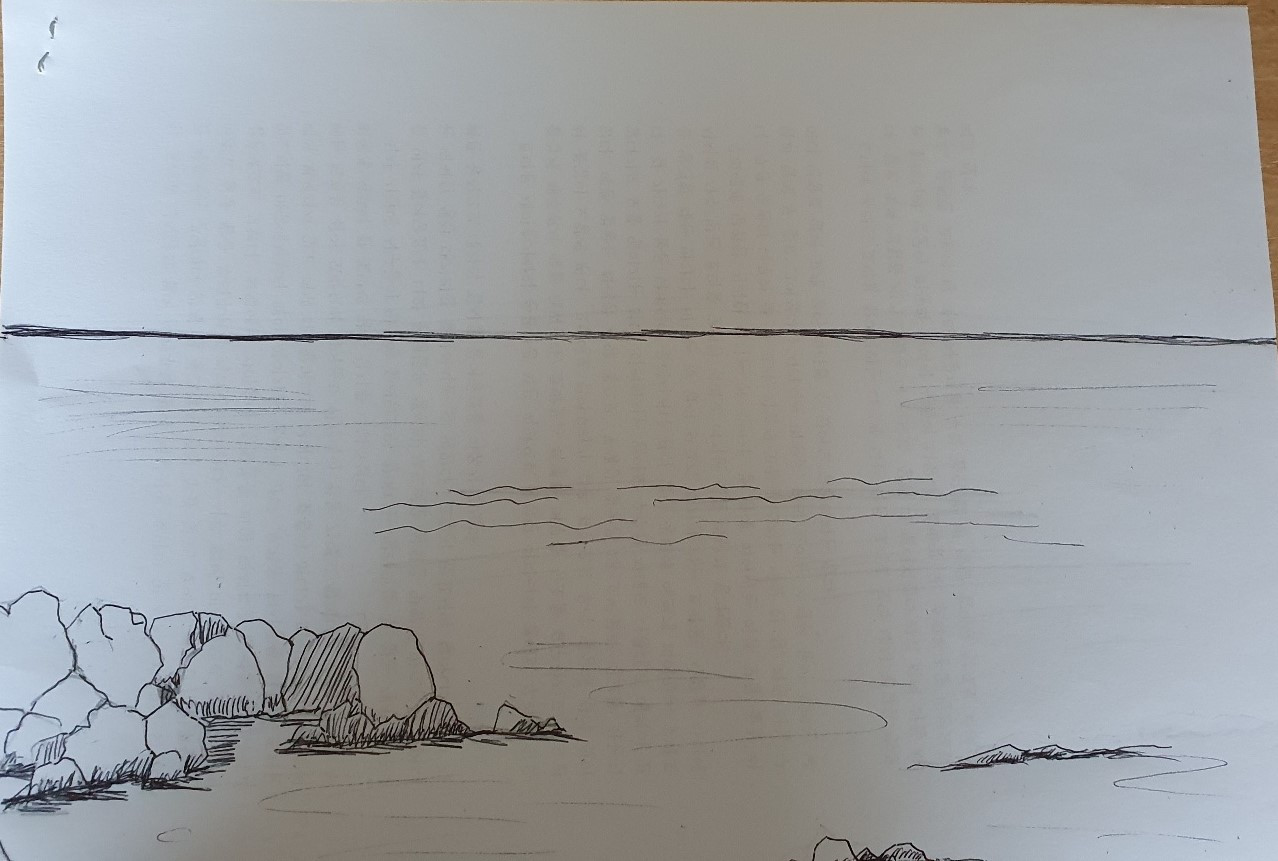 월령리 바닷가에서 고즈넉한 분위기에 잠겨 바다를 바라보았다. 멀리 보이는 수평선이 자로 잰 듯 반듯한 선으로 하늘과 바다를 나누었다. 아침해가 완전히 떠오르지 않은 하늘빛에 맞추어 바다는 가라앉은 푸른빛을 띠었다. 아직은 캠핑하는 사람들이 없어 주변은 사람 그림자가 보이지 않아 조용한 바다는 나 혼자만의 차지가 되었다. 바다는 움직임이 없어 보였다.