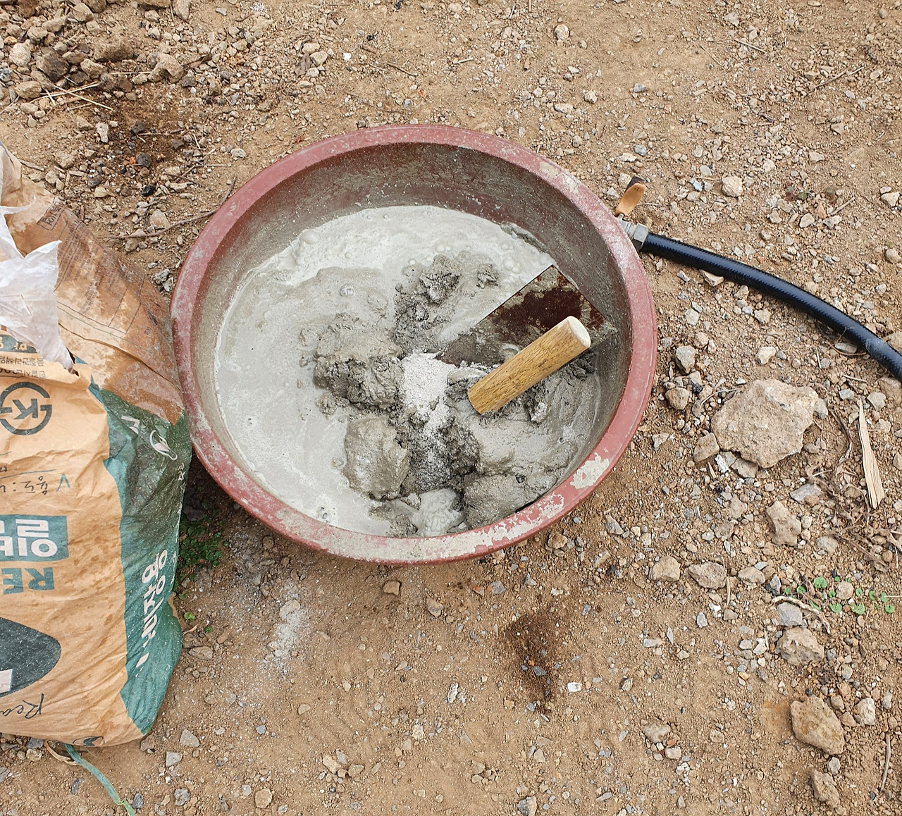전문가용 도구가 없어서 집에 있는 작은 고무 다라를 사용했다. 시멘트를 쏟아 붓기에 힘에 부쳐 소량씩 물에 개어 사용할 참이었다.