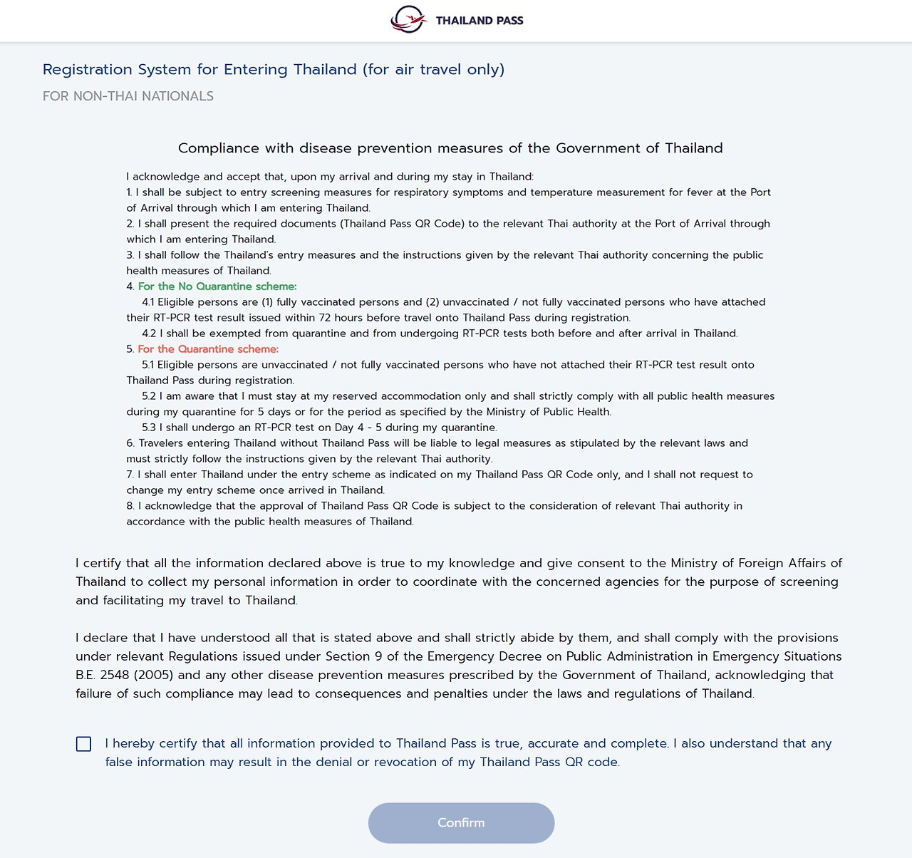 저는 제가 읽었다는 것을 인정하며, 따라서 태국 패스 등록 약관을 준수하기로 동의합니다. 나는 내가 아는 한 또는 내가 믿는 한 모든 진실한 정보를 제공했음을 증명합니다. 허위사실이 알려지면 태국 관련 정부기관이 나의 태국 여행을 거부하고 금지할 수 있는 것으로 알고 있으며, 필요하다면 태국법에서 요구하는 대로 법적 조치를 취할 수 있다.